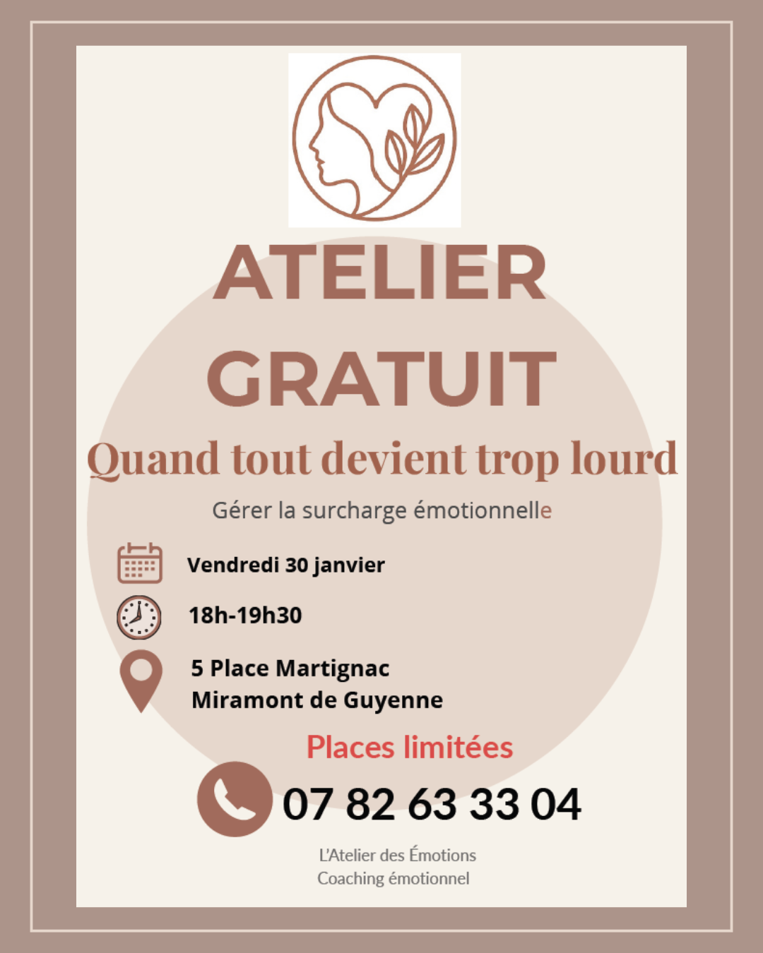Elle propose un atelier gratuit à destination des femmes qui se sentent épuisées par leur quotidien, qui vivent un trop-plein d'émotions ou qui se trouvent bloquées dans leurs choix et leurs actions.