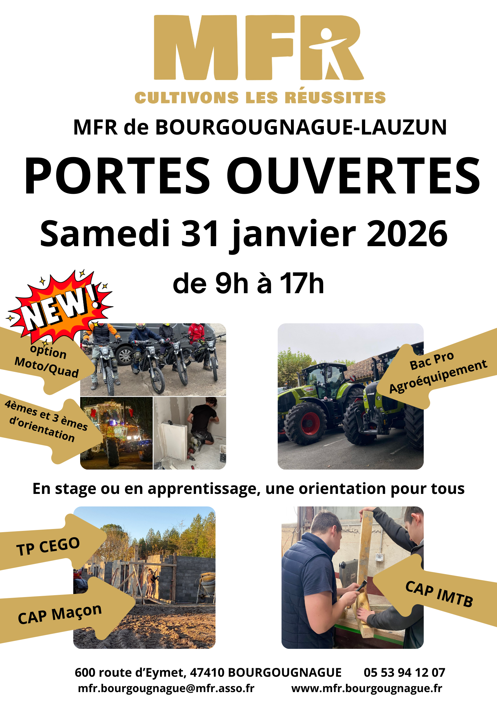 La MFR de Bourgougnague-Lauzun vous invite aux portes ouvertes le samedi 31 janvier 2026 de 9h à 17h