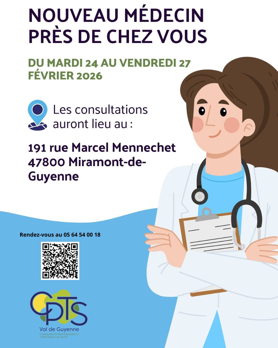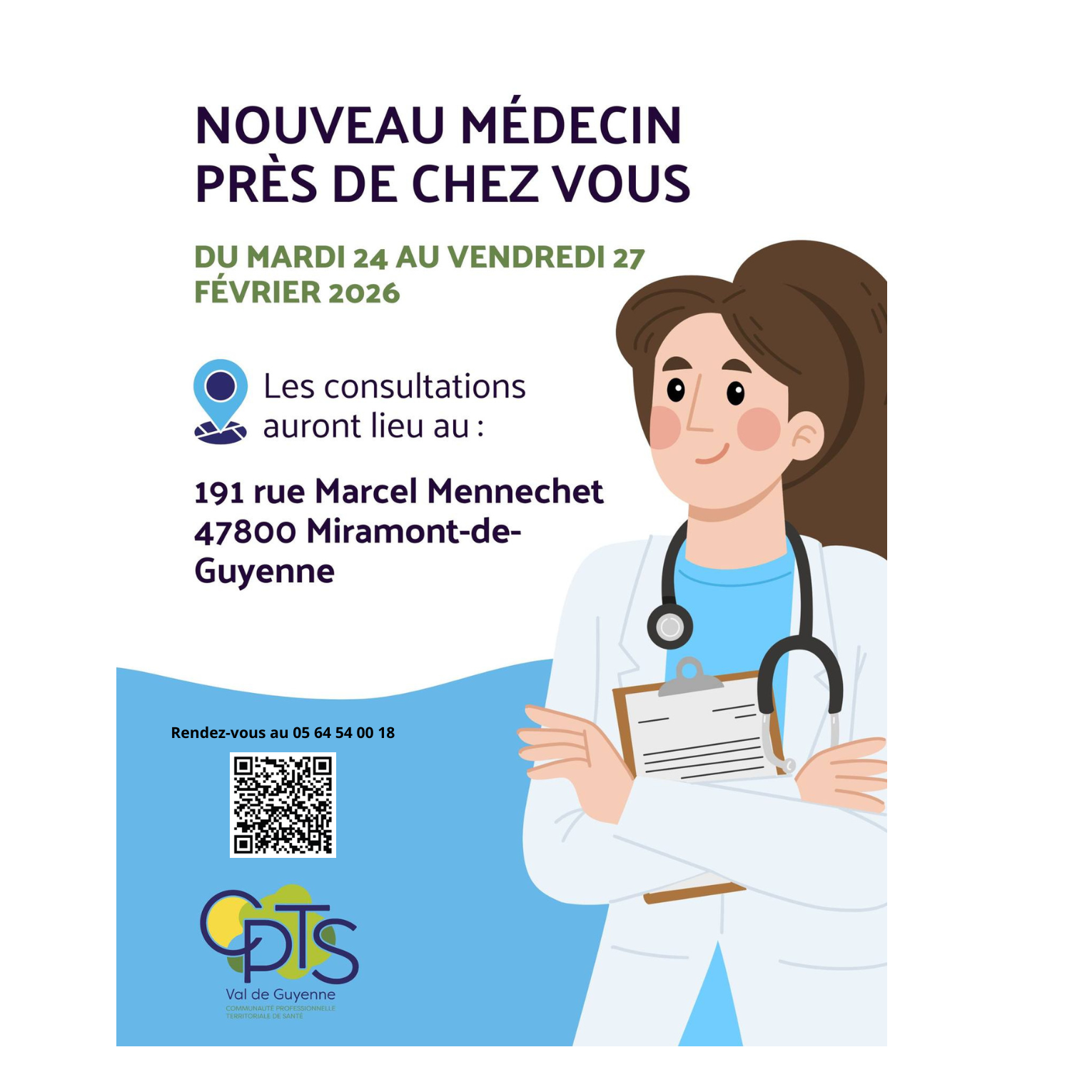 NOUVEAU : Consultations de médecine générale et de gynécologie à Miramont-de-Guyenne !Dans le cadre du dispositif “Un médecin près de chez vous”, une médecin généraliste et gynécologue viendra consulter