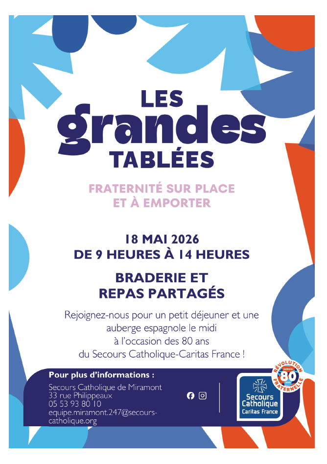 À l'occasion des 80 ans du Secours catholique, les bénévoles de l'antenne locale miramontaise vous donnent rendez-vous le LUNDI 18 MAI pour une grande braderie (tout à moitié prix, avec une zone de gratuité étendue). Un petit déjeuner sera offert dans la matinée et une auberge espagnole organisée le midi. Suivez notre page pour d'autres précisions et surprises à venir !