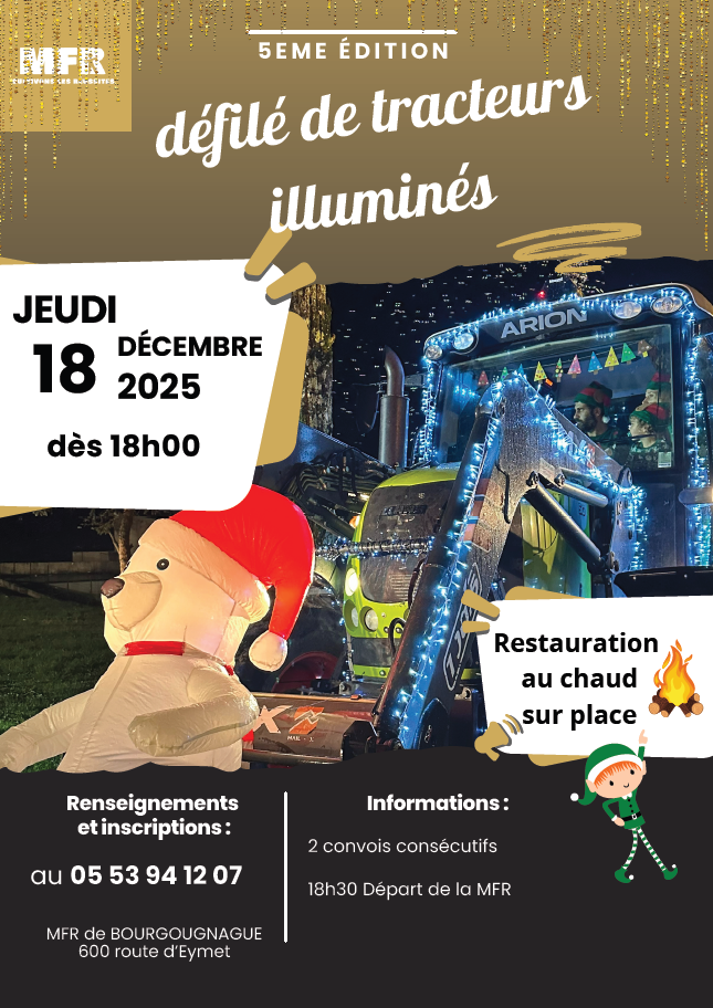 La MFR Bourgougnague vous donne rendez-vous le 𝗷𝗲𝘂𝗱𝗶 𝟭𝟴 𝗱𝗲́𝗰𝗲𝗺𝗯𝗿𝗲 𝟮𝟬𝟮𝟱 pour une soirée lumineuse, conviviale et haute en couleurs.