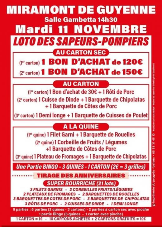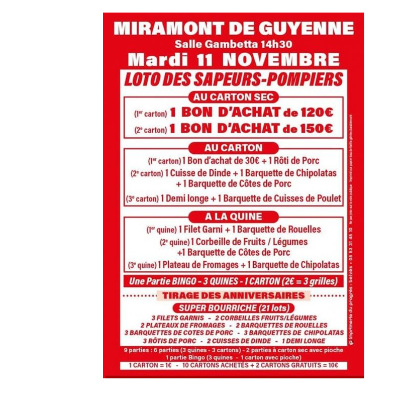 Venez nombreux participer au loto organisé par l'association Amicale des Sapeurs-Pompiers.